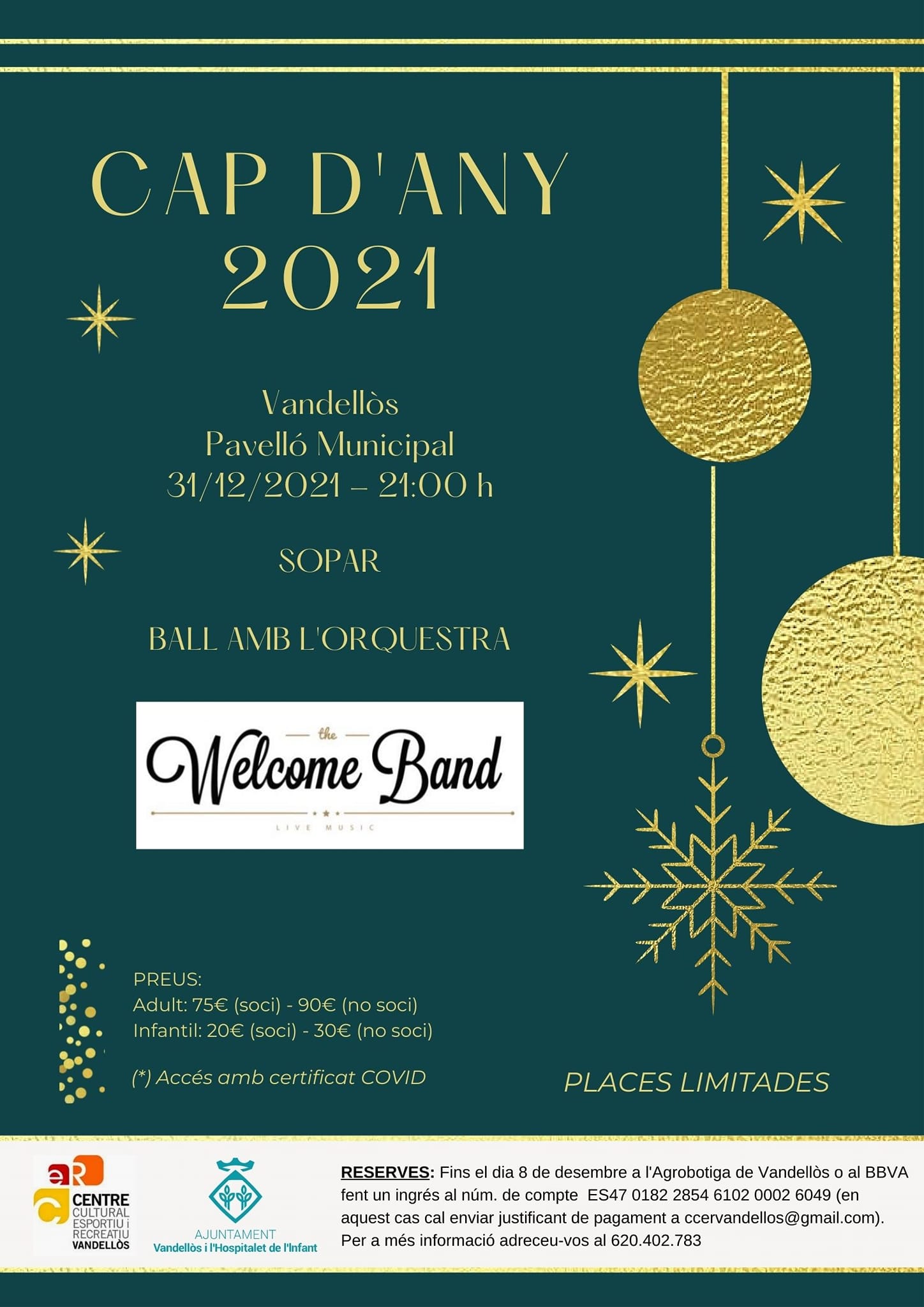 Per la revetlla de Cap d'Any, el Centre Cultural, Esportiu i recreatiu de Vandellòs havia organitzat, un any més, el sopar de Gala i una festa amb orquestra que havia de tenir lloc al Pavelló del poble. Aquest acte ha quedat suspès a causa de la situació de la pandèmia de la Covid-19.