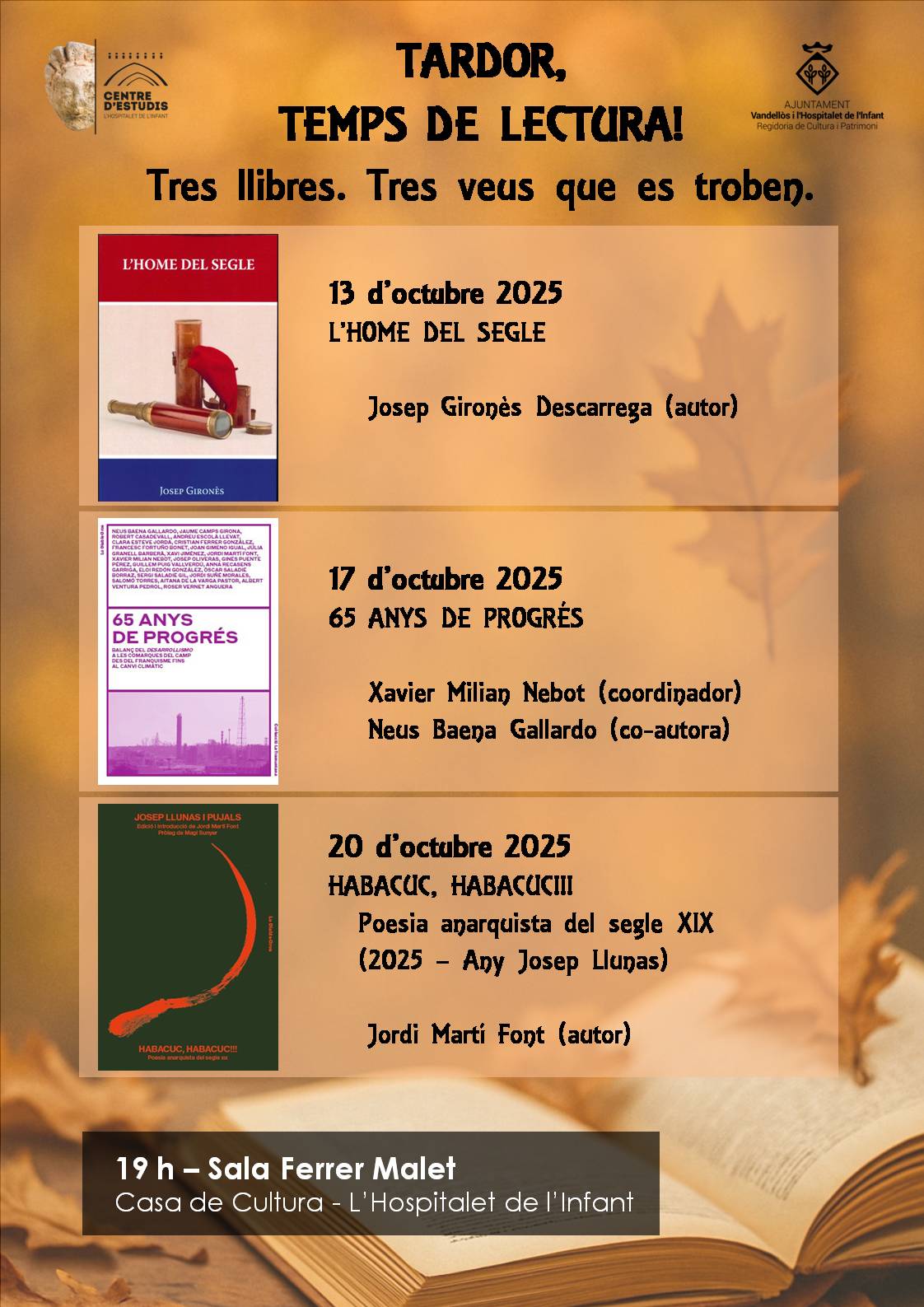 - Tardor, temps de lectura! Tres llibres. Tres veus que es troben / Dies 13, 17 i 20 d'octubre a l'Hospitalet de l'Infant